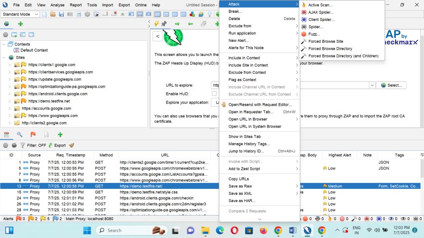 - Active Scan: Right-click the target site in the left panel, select Attack → Active Scan. ZAP will test for vulnerabilities like XSS, SQL Injection, and Broken Authentication.