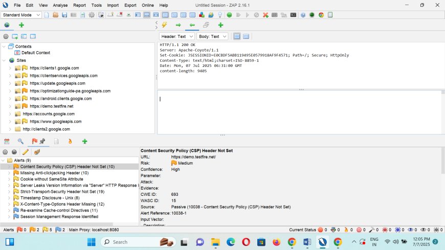 - Analyze the Results: After the scan, alerts appear with risk levels (High, Medium, Low). Click an alert for details and fixes.